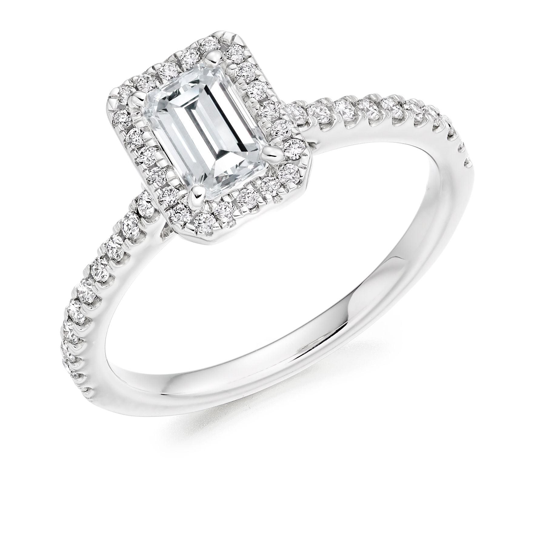 Emerald cut diamonds have a modern geometric look with parallel rectangular facets.