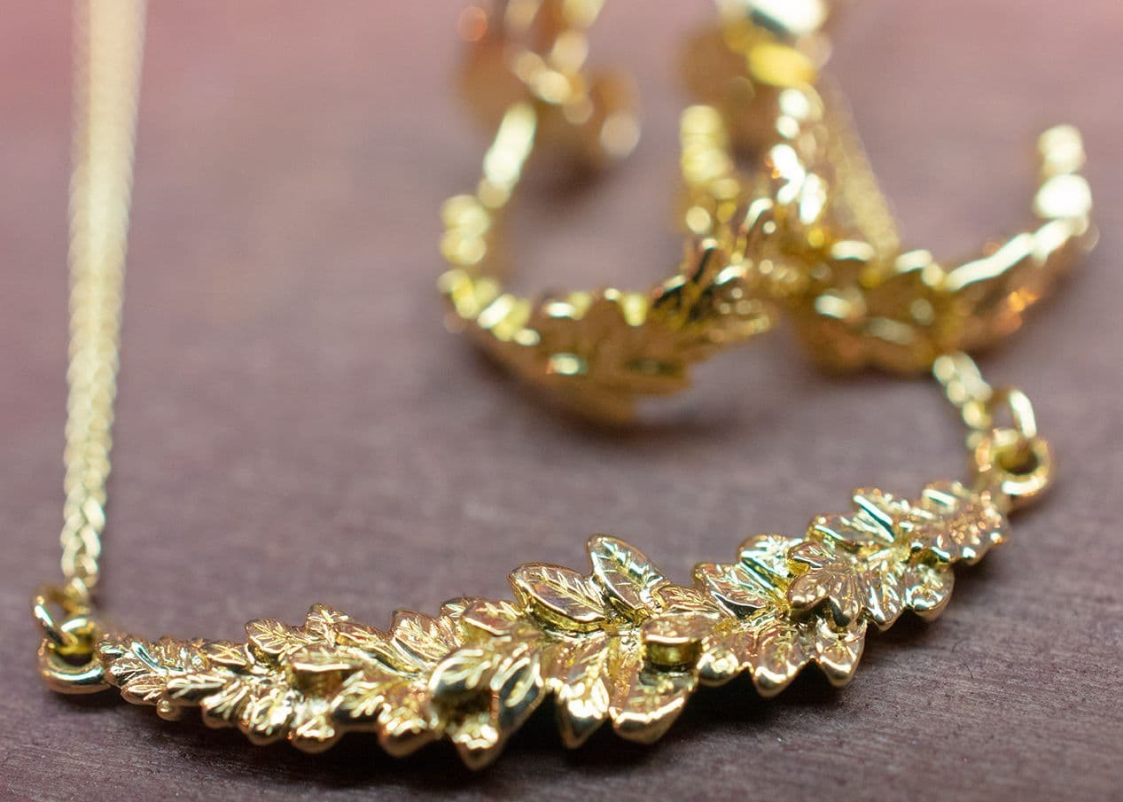 “Our Native Flora collection is hand crafted in Fairtrade 18ct gold. Elegant botanical forms are inspired by sketches of Scottish flora such as Rowan, Bracken and Heather, embodying a love of our wild countryside. Handmade in our Edinburgh workshop, each piece is carefully hand engraved, bringing it to life in intricate detail. This organic process gives every item in the collection completely unique variations.” Handmade by Jen