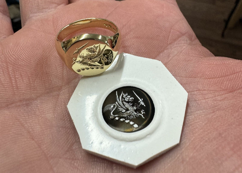 In the appointment we will discuss family crests or whatever ideas you would like to be engraved. You can try on different size and shaped signet rings to see what suites your finger best.