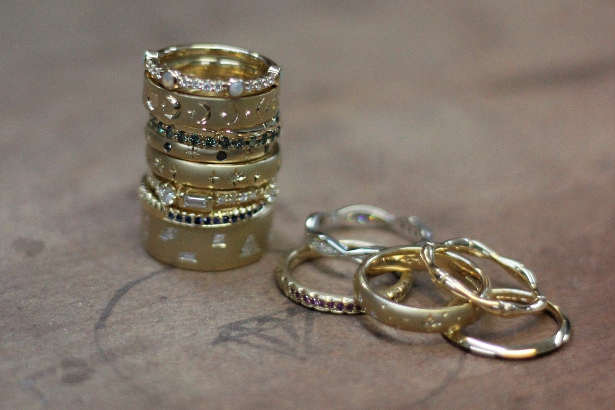 Introducing our latest collection, designed by our in house jeweller Jen. 9ct yellow gold stacking rings peppered with celestial star bursts and moons, inspired by the night sky.
