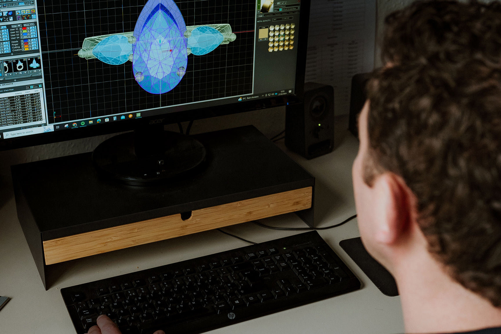 Our bespoke jewellery journey begins with a simple sketch and a conversation. We collaborate closely with our clients to bring their visions to life, whether it's a refined engagement ring, a botanical-inspired pendant, or a bold gemstone dress ring. Our in-house CAD designers then transform these sketches into detailed digital designs, which are further refined to perfection. Utilizing state-of-the-art 3D printing technology, we create precise prototypes for our clients to try on, ensuring a perfect fit and design before the final creation.